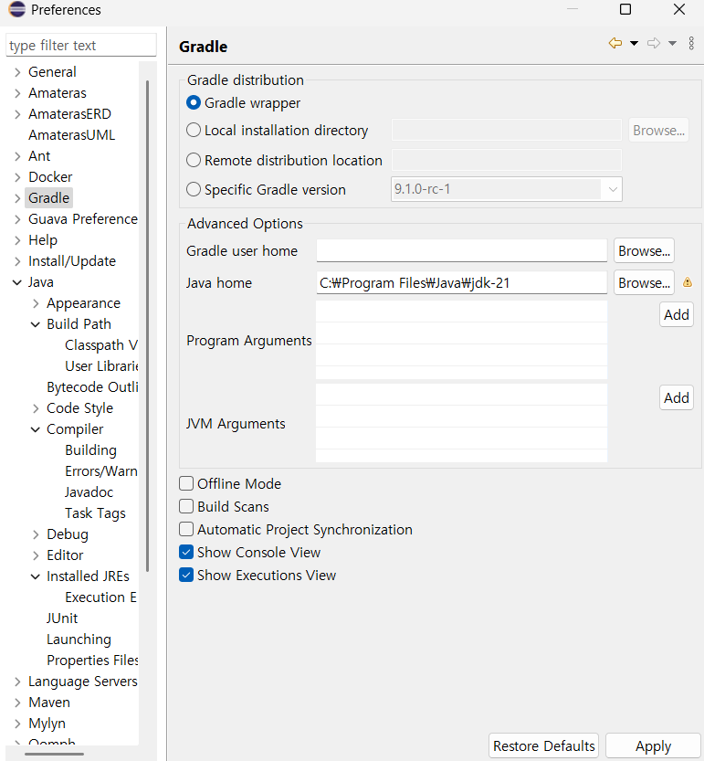 3. Gradle > Gradle Java home 경로 jdk-21 경로로 됐는지 확인(젤 중요하다!!!) 만약 여기서 안됐다면 경로를 올바르게 바꿔주자.