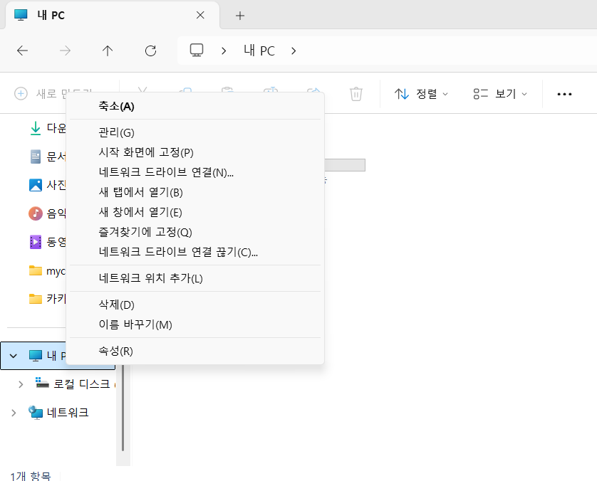 설치한 후, 폴더의 내pc 우클릭 -> 속성 들어가기