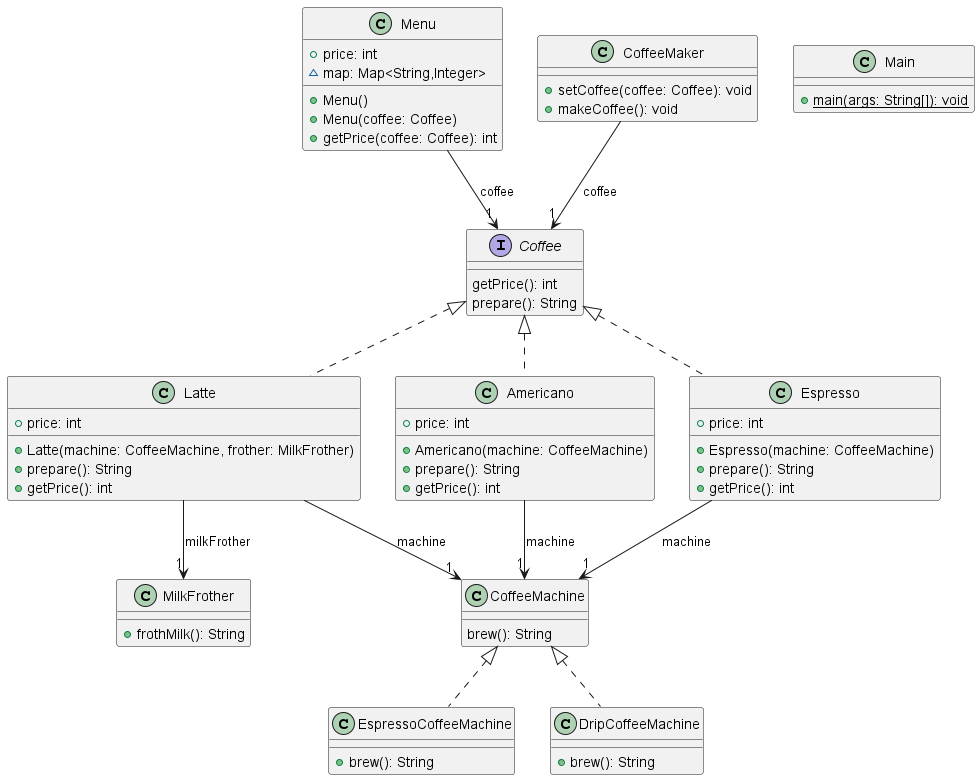 - 의존성 역전 원칙 : 각각의 prepare() 함수 내부에서 machine.brew()를 부른다. 여기서 machine은 외부에서 생성 받았다.(의존성을 주입 받았다.) 주입 방법 중 생성자를 통한 방법을 사용한 것이다.