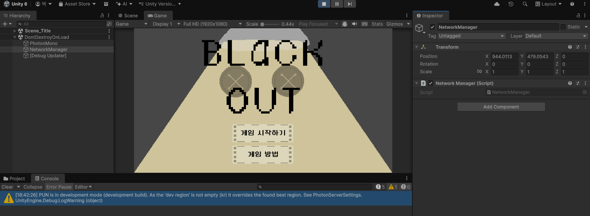 - 씬 이동 시 이 네트워크 매니저가 Destroy되면 안되므로 DontDestroyOnLoad(gameObject); 를 붙였다.