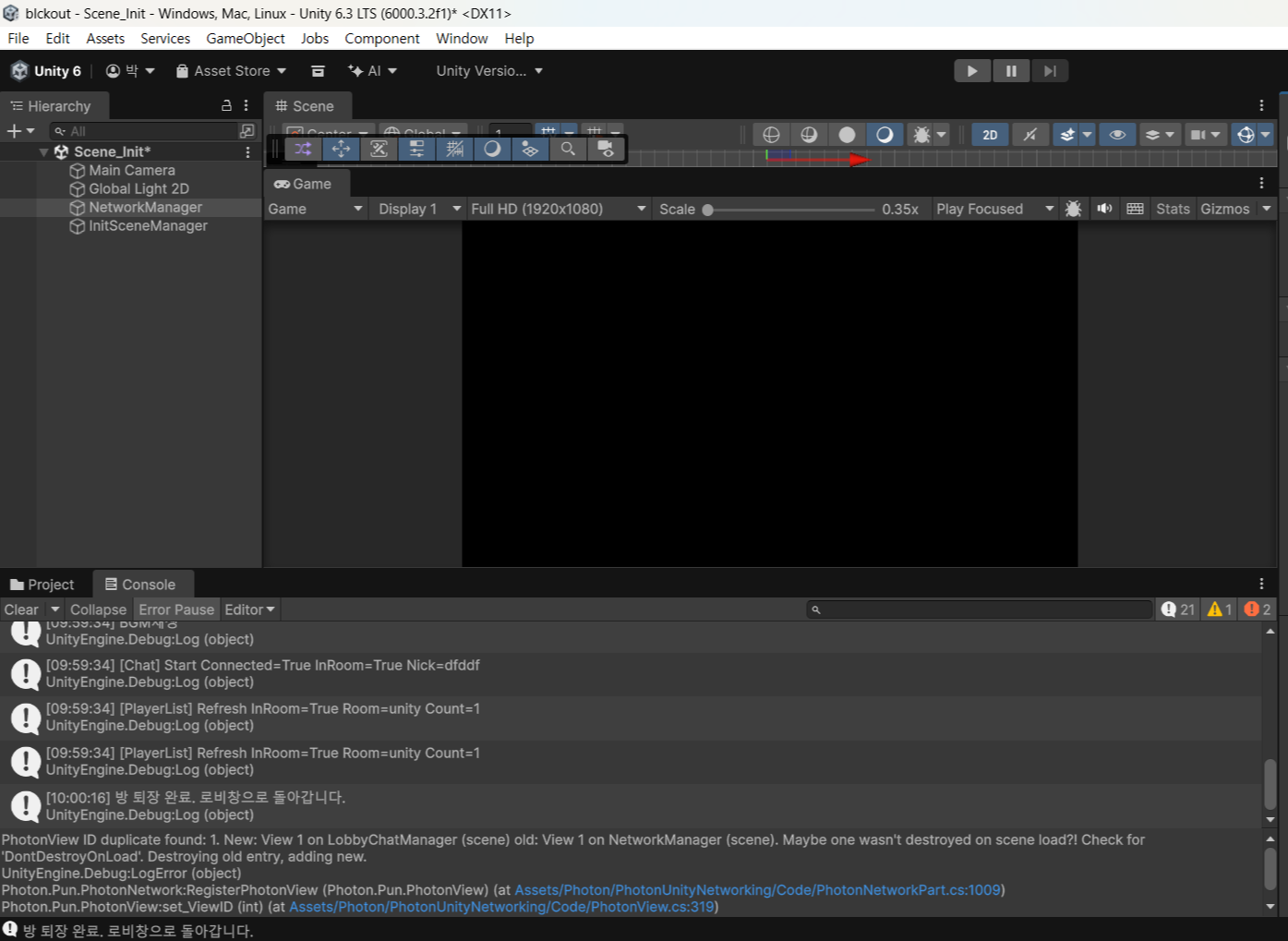 초기에는 접속씬의 ConnectSceneManager.cs 스크립트가 네트워크 연결부터 UI 처리까지 모두 구현하도록 코드를 짜려고 했지만, 암만 생각해도 단일책임의 원칙을 어긴 것이고, 유지보수에 악영향을 끼칠 것 같아 NetworkManager.cs 에 네트워크 관련 코드를 넣고, Init씬(일종의 까만 로딩화면)을 만들어서 거기다가 NetworkManager.cs 를 갖고 있는 오브젝트를 놓기로 했다.