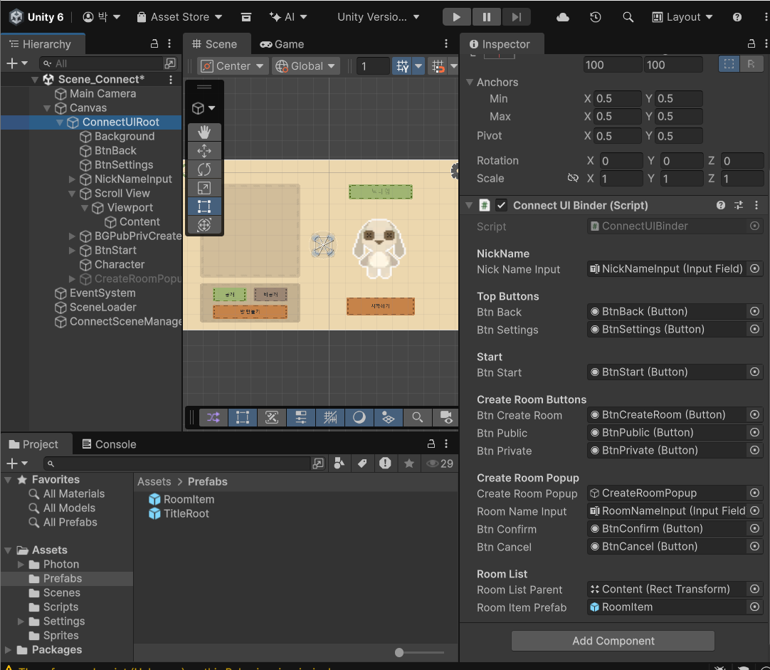 - 작업: 방 만들기/참여 필수 UI 배치, ConnectSceneManager 스크립트 작성, 버튼-Inspector 레퍼런스 연결