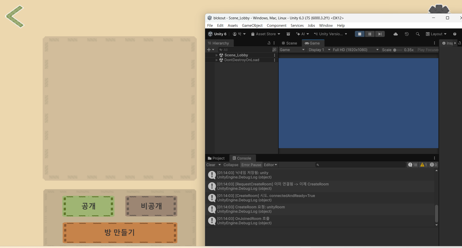 - 메모(협업): 인스펙터 연결 누락 시 RoomList/UI 갱신이 안 될 수 있음(씬 오브젝트 참조 확인 필요)